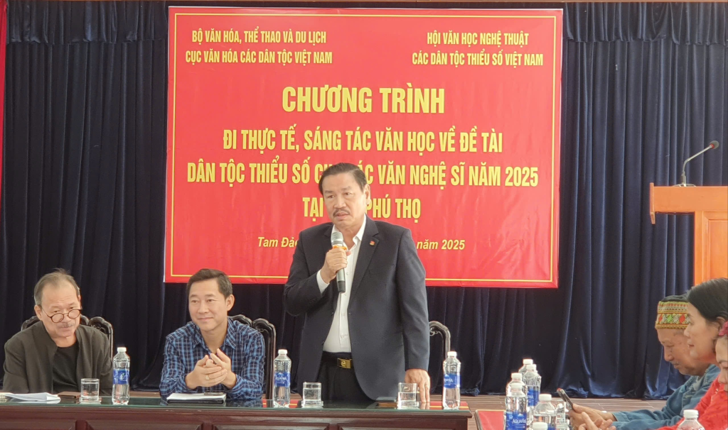 Phát biểu tại buổi lễ, ông Lê Thanh Hòa – Phó Trưởng phòng phụ trách Phòng Nghiệp vụ Văn hoá dân tộc, Cục Văn hoá dân tộc Việt Nam nhiệt liệt chào mừng các hội viên đã về với Phú Thọ, mảnh đất Vua Hùng. Ông nhấn mạnh mục đích của chuyến đi là nhằm có sáng tác đóng góp công cuộc bảo tồn và phát huy bản sắc văn hóa các dân tộc thiểu số (VHDTTS), tạo cầu nối giữa đời sống nhân dân với “cây viết, cây cọ” của người nghệ sĩ. Bộ Văn hóa, Thể thao và Du lịch (VH-TTDL) mong muốn qua hành trình thực tế này, các VNS sẽ có cơ hội tìm hiểu cặn kẽ về văn hóa, tín ngưỡng, lối sống, và cách thức sản xuất của đồng bào, từ đó tạo ra những tác phẩm phản ánh sinh động đời sống văn hóa, thẩm mỹ, khơi dậy những giá trị văn hóa tiềm ẩn. Ông tin tưởng rằng, với góc nhìn sâu sắc của người nghệ sĩ, hình ảnh Đất Tổ Vua Hùng cùng những nét đẹp VHDTTS sẽ được lan tỏa mạnh mẽ. Ông Hòa cũng bày tỏ kỳ vọng những ghi chép, phản ánh chân thực về đời sống văn hóa DTTS, bằng tài năng và tâm huyết của VNS, sẽ gặt hái nhiều thành công, góp phần bảo tồn và phát huy bản sắc VHDTTS trong thời đại mới.