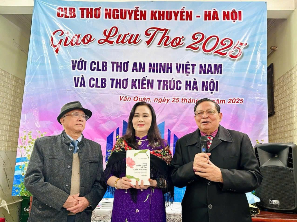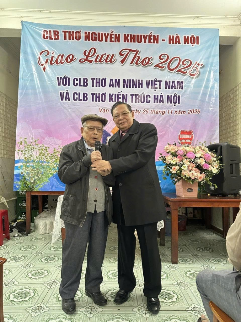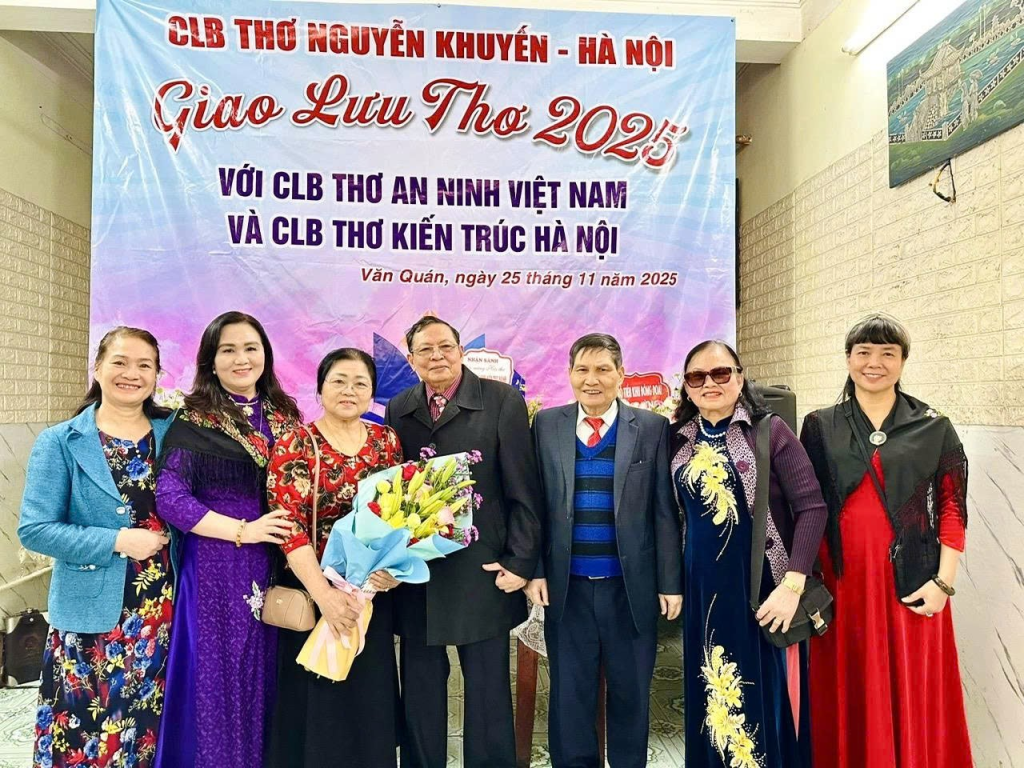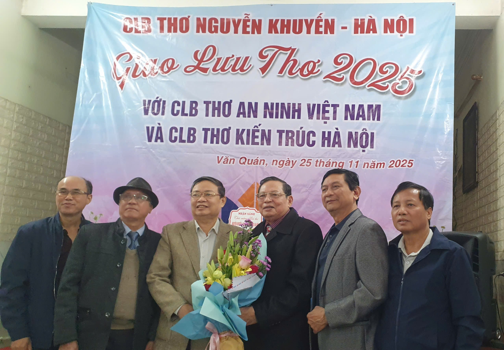 Ngày 25 tháng 11 năm 2025, một sự kiện văn hóa thi ca ấm cúng nhưng không kém phần trang trọng đã diễn ra tại số 72 Nguyễn Khuyến, Hà Nội – điểm gặp gỡ thường nhật của các thành viên Câu lạc bộ (CLB) Thơ Nguyễn Khuyến. Cuộc gặp gỡ, giao lưu thơ ca đầy ý nghĩa này quy tụ ba đơn vị thơ của thủ đô và cả nước, bao gồm: CLB Thơ Nguyễn Khuyến – Hà Nội, CLB Thơ An Ninh – Việt Nam, CLB Thơ Kiến trúc Hà Nội. Sự kiện là dịp để các thi hữu ôn lại kỷ niệm, chia sẻ những tác phẩm mới và cũng là một diễn đàn thơ thắp lên tinh thần đoàn kết, lạc quan, và ý chí vượt qua mọi thử thách, thiên tai của dân tộc.