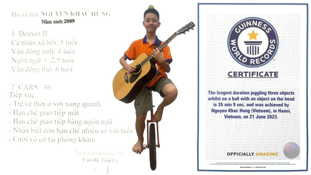 – Khắc Hưng từ trẻ tự kỷ nặng, cấp độ 3, trở thành đa kỷ lục thế giới Guinness. Đặc biệt em liên tục biểu diễn nhiều nơi và được đón chào nồng nhiệt (đi xe đạp 1 bánh (1-foot unicycling), Giữ bóng trên đầu, chơi Guitar fingerstyle phong cách Marcin).