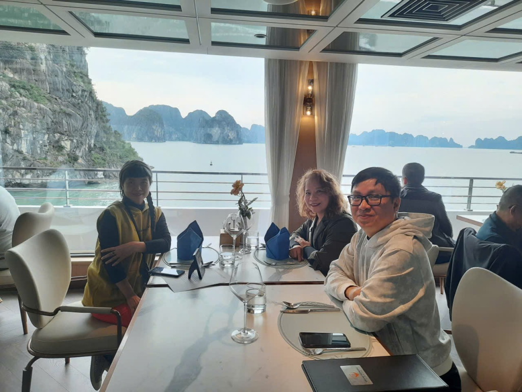 Mỗi tối, trước bữa ăn, không gian du thuyền lại rộn ràng, ấm áp hơn bởi vũ điệu vui nhộn của đội ngũ nhân viên phục vụ bàn. Những bước nhảy ngẫu hứng, những nụ cười tươi rói đã tạo nên sự kết nối tuyệt vời giữa người làm dịch vụ và du khách. Và rồi, anh chàng ảo thuật gia tên Kiệt xuất hiện. Đẹp trai, tiếng Anh giỏi, cách giao tiếp hài hước cùng tài nghệ ảo thuật cao tay đã làm kinh ngạc cả du khách ngoại quốc lẫn ba người Việt chúng tôi. Đó không chỉ là giải trí, đó là sự trình diễn của tài năng và sự tận tâm, là linh hồn của dịch vụ chất lượng sáu sao.