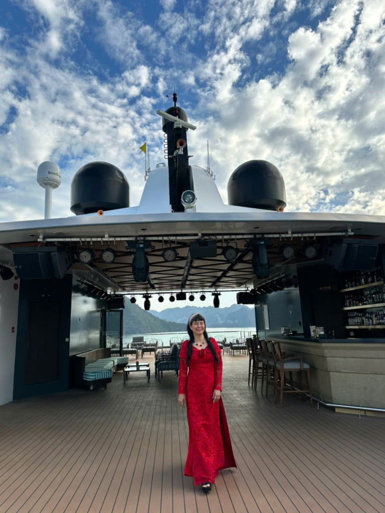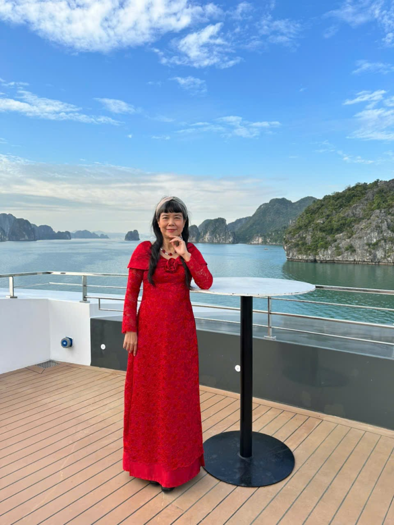 Trong khi du khách nước ngoài thích thú với trải nghiệm làm món nem rán truyền thống, thì ba chúng tôi – những tâm hồn đã quá đỗi quen thuộc với hương vị quê nhà – lại lựa chọn lên boong tàu. Đó là nơi lý tưởng để thực hiện một bộ ảnh thời trang cùng siêu du thuyền và kỳ quan thế giới. Tôi đã cất công mang theo một bộ áo dài dạ hội lộng lẫy do nhà thiết kế Hoàng Ly tạo mẫu. Giữa kỳ quan hùng vĩ, tôi muốn tạo ra cái khoảnh khắc “vịt cỏ hóa thiên nga,” để nhà nhiếp ảnh xịn Đỗ Lan Hương và cả nhiếp ảnh bất đắc dĩ Nguyễn Đình Tú tha hồ tác nghiệp, ghi lại cái đẹp giao thoa giữa con người, nghệ thuật và thiên nhiên.