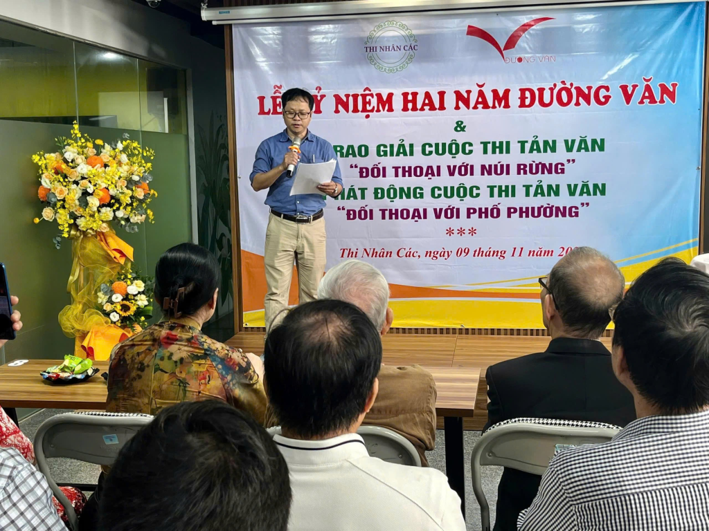 Ngày 09 tháng 11 năm 2025, tại không gian trang nhã của Thi Nhân Các (Hà Nội), Ban Biên tập (BBT) chuyên san Đường Văn đã tổ chức Lễ kỷ niệm 2 năm ra đời và phát động cuộc thi viết tản văn mới mang tên “Đối thoại với phố phường”. Sự kiện đánh dấu chặng đường hai năm đầy nỗ lực của một ấn phẩm in giữa thị trường văn học nhiêu khó khăn, cũng là ngày hội vinh danh những tài năng đáng chú ý tại Lễ Trao giải Cuộc thi Tản văn lần thứ Nhất – “Đối thoại với núi rừng” năm 2025.