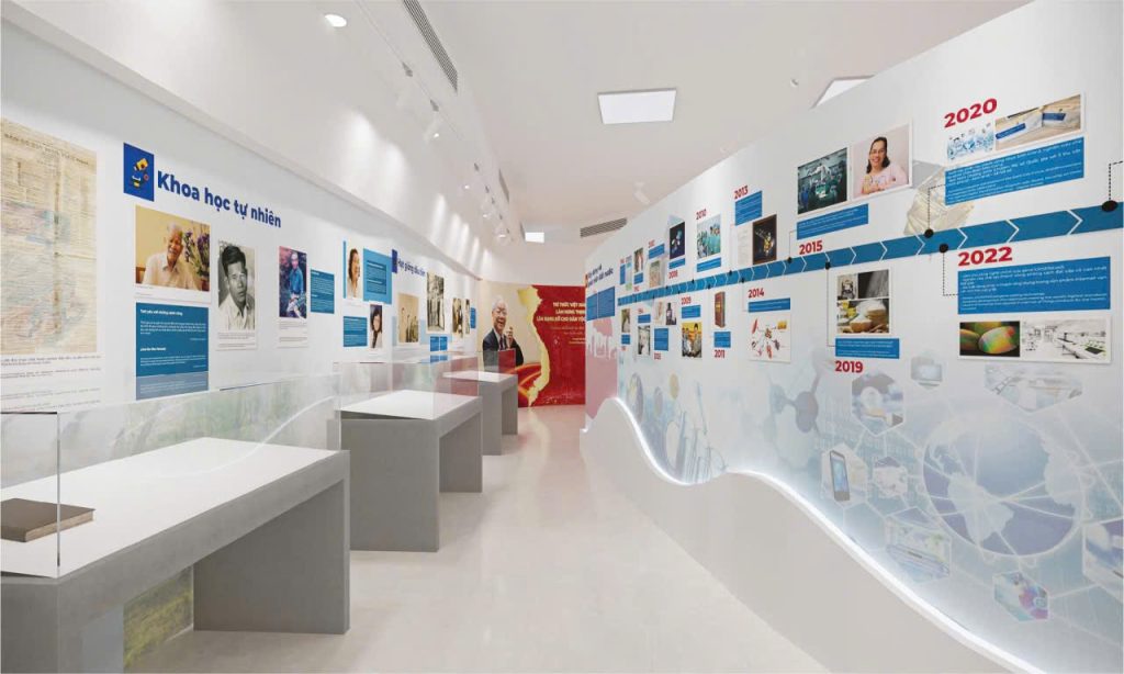 Không gian trưng bày được bố trí tại tầng 3 tòa nhà “Quyển sách” trong khuôn viên Công viên Di sản, giới thiệu hơn 150 nhà khoa học tiêu biểu cùng gần 200 tài liệu, hiện vật quý. Nội dung được chia thành hai chủ đề chính: “Bảo vệ Tổ quốc” và “Xây dựng – phát triển đất nước”.