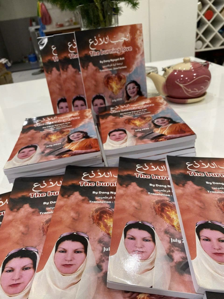 Sau một hành trình kéo dài và đầy trắc trở, cuối cùng, cuốn sách thơ “Tình yêu lửa cháy” (bản chuyển ngữ tiếng Ả Rập) đã về đến tay nữ sĩ Đặng Nguyệt Anh tại Tp. Hồ Chí Minh, Việt Nam trung tuần tháng 11 năm 2025. Tập thơ được dịch bởi nhà thơ – dịch giả Ma-rốc Izza Fartmis và xuất bản vào tháng 7 năm 2025 bởi NXB Imprimerie – Papeterie Bilal tại Ma-rốc.