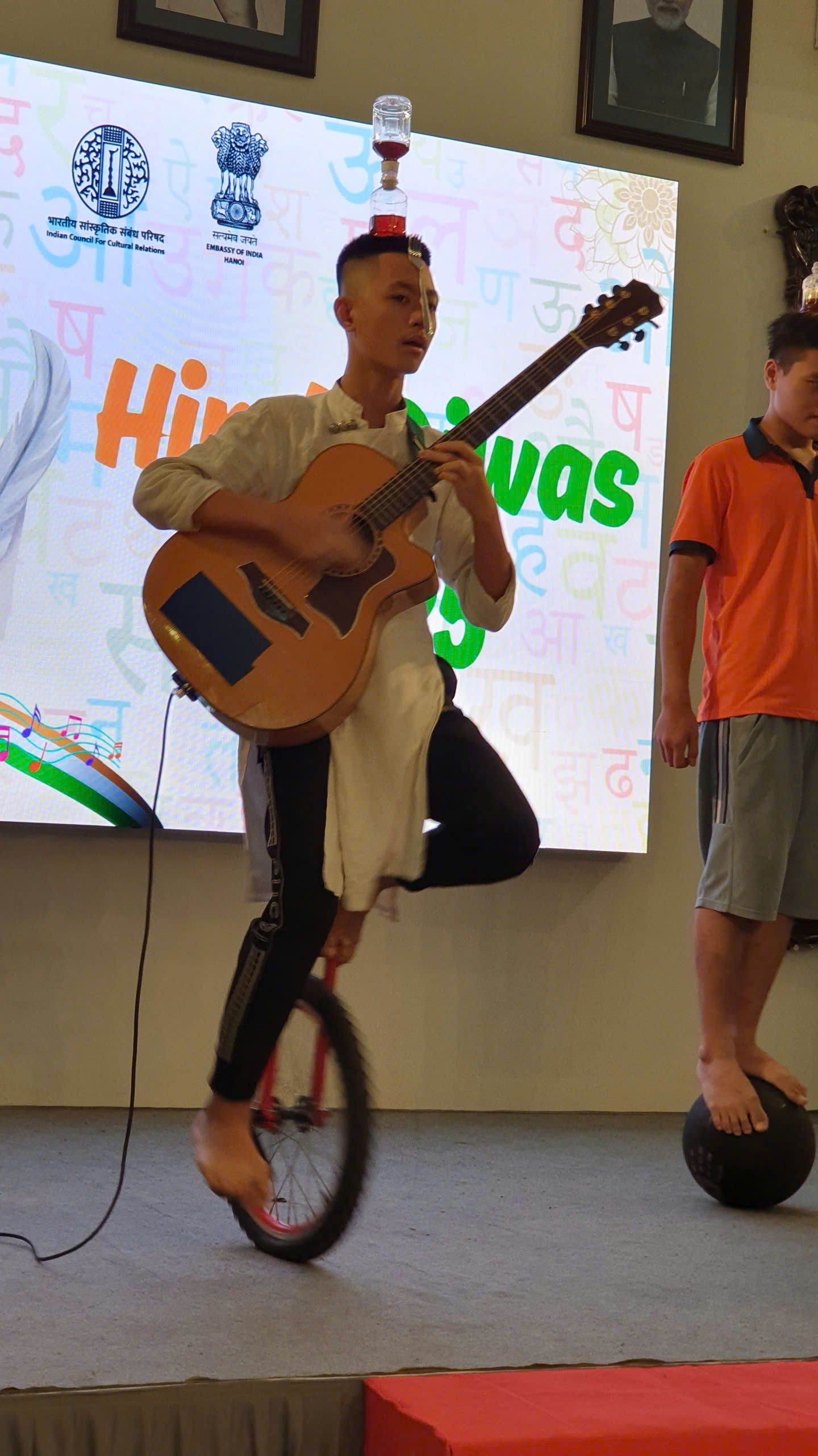 Nhân dịp Hindi Diwas, Khắc Hưng đã mang đến một tiết mục đặc biệt: 4 trong tuoi-16-ky-dieu-cua-nguyen-khac-hung-khi-tinh-than-hindi-diwas-giao-hoa-voi-hon-phat-1, vừa đi xe đạp một bánh một chân, đồng thời đội 2 chai lên đầu, vừa dính nĩa trên mặt và chơi đàn guitar gõ đập percussive fingerstyle bản nhạc Ân Độ thiêng liêng Shiva Tandava Stotram. Khắc Hưng trong tà áo dài truyền thống Việt Nam, cậu như hóa thân thành cầu nối giữa hai nền văn hóa: Ấn Độ linh thiêng và văn hóa Việt Nam sâu lắng. Khi âm nhạc hòa với xiếc với chuyển động, chúng ta thấy rõ sự giao thoa của cái đẹp và cái chân — cái chân ở đây là lòng thành tâm, là niềm tin không rời. Thật là bất ngờ khi tiếng đàn guitar của Hưng vang lên cả hội trường đã đứng dậy vỗ tay liên tục tất cả đều giơ điện thoại lên livestream.